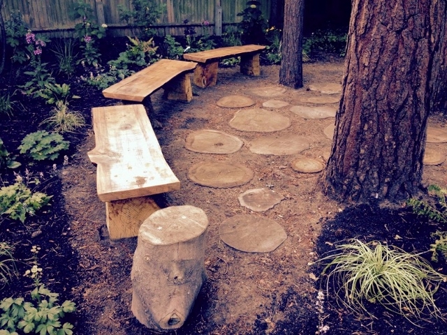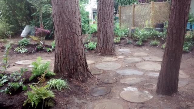 It is always a challenge to design Woodland Planting in a garden. You need to be clear on just how much light will be able to reach the plants you put in. The owner of this garden loved her tall cedar trees and the woodland feel of her garden, but there was no space to sit in the afternoon sun, and no interesting plants to enjoy. The sunniest part of the garden in the afternoon was full of large holly bushes, and an old compost heap. I felt that once the we cleared the area under 3 cedar trees, a patio or a deck would look out of place, too formal. This area of the garden needed something more natural, and something that wouldn’t look messy when the pine needles fell. I decided to use wood rounds as the basis for my seating area. I have seen these used as paths before and it seemed like the ideal solution. Working with my local tree surgeon, and my contractor we selected some beautiful whole sections of oak and cedar rounds. They were big heavy pieces that could withstand years of being partially buried in well drained soil. We also commissioned some beautiful cedar benches made with whole slices of tree, letting the natural shape of the tree remain, these will age to a beautiful silver colour and blend into the woodland scene over time.